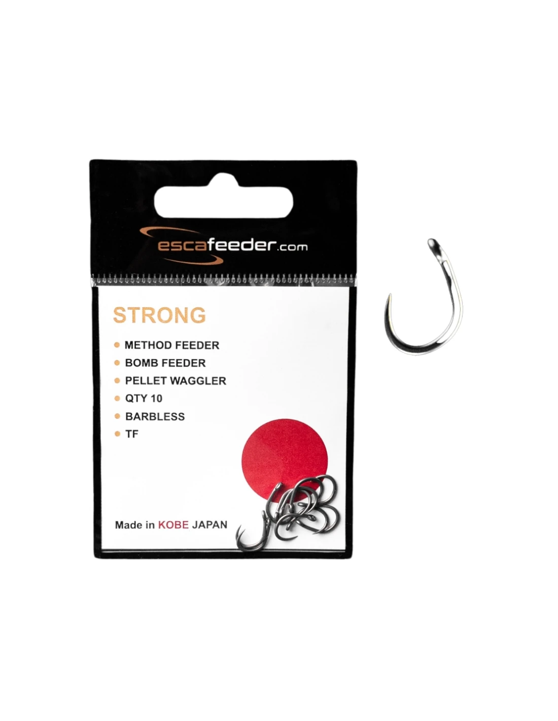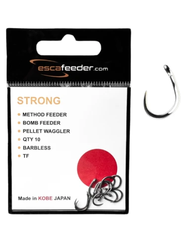 Escafeeder Strong – Haki do zadań specjalnych. Wykonane z bardzo mocnego drutu zapewniają niesłychaną moc.Hak można stosować w trudnych warunkach (grążele trzciny ,zaczepy ) gdzie rybie nie możemy pozwolić na odjazd, bardzo wskazane również do łowienia na dalekich dystansach, gdzie koniecznością jest bardzo mocne zacięcie. Doskonale sprawdzi się w metodzie przy zastosowaniu grubszego przyponu z żyłki lub plecionki. Odpowiedni kształt gwarantuje pewne zacięcie i hol ryby.