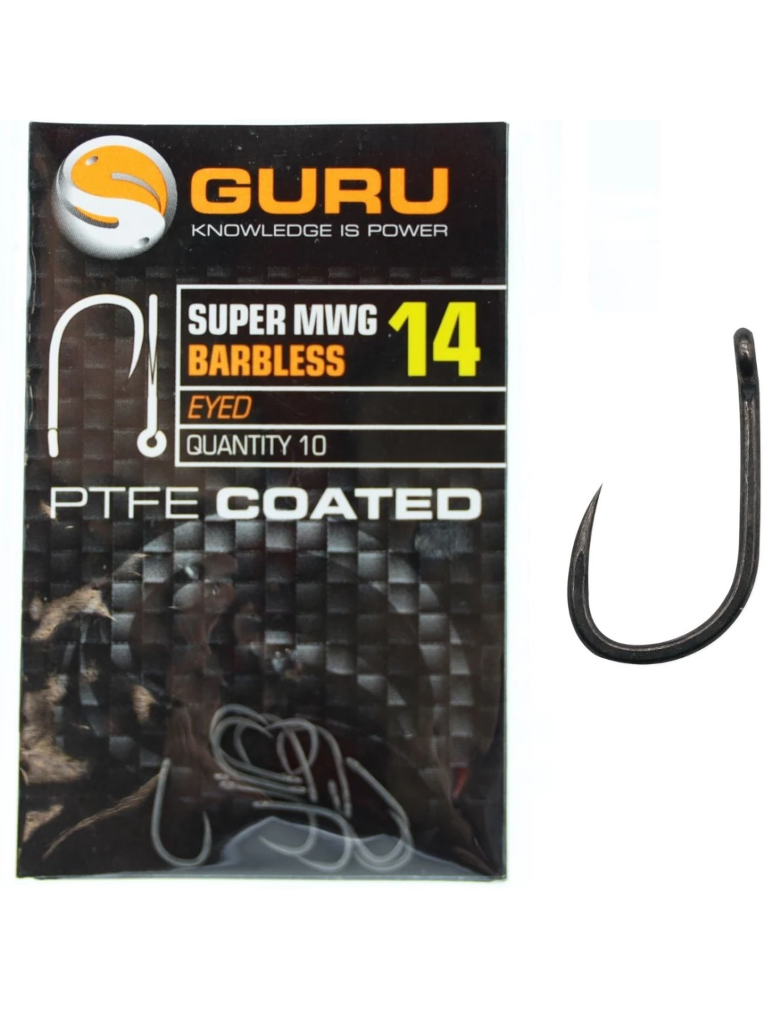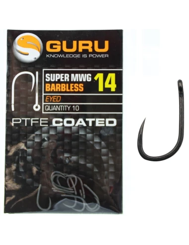 Haczyki bezzadziorowe Guru Super MWG rozmiar 10. Wykonane z dość grubego drutu co czyni je bardzo mocnymi i wytrzymałymi. Pokryte zostały antyrefleksową powłoką PTFE. Szerokie rozwarcie zakończone super ostrym jak brzytwa ostrzem, sprawia że ryby zacinają się w błyskawicznym tempie. Jest to mocny hak idealny do method feeder. Posiada duże oczko, dzięki czemu pozwala to na wiązanie przyponów z naprawdę grubej żyłki. Opisywany rozmiar jest największym haczykiem z tej serii, który przede wszystkim wyselekcjonuje nam z łowiska duże karpie. Dzięki swojej mocy pozwoli na wyjęcie sporych rozmiarów ryby.