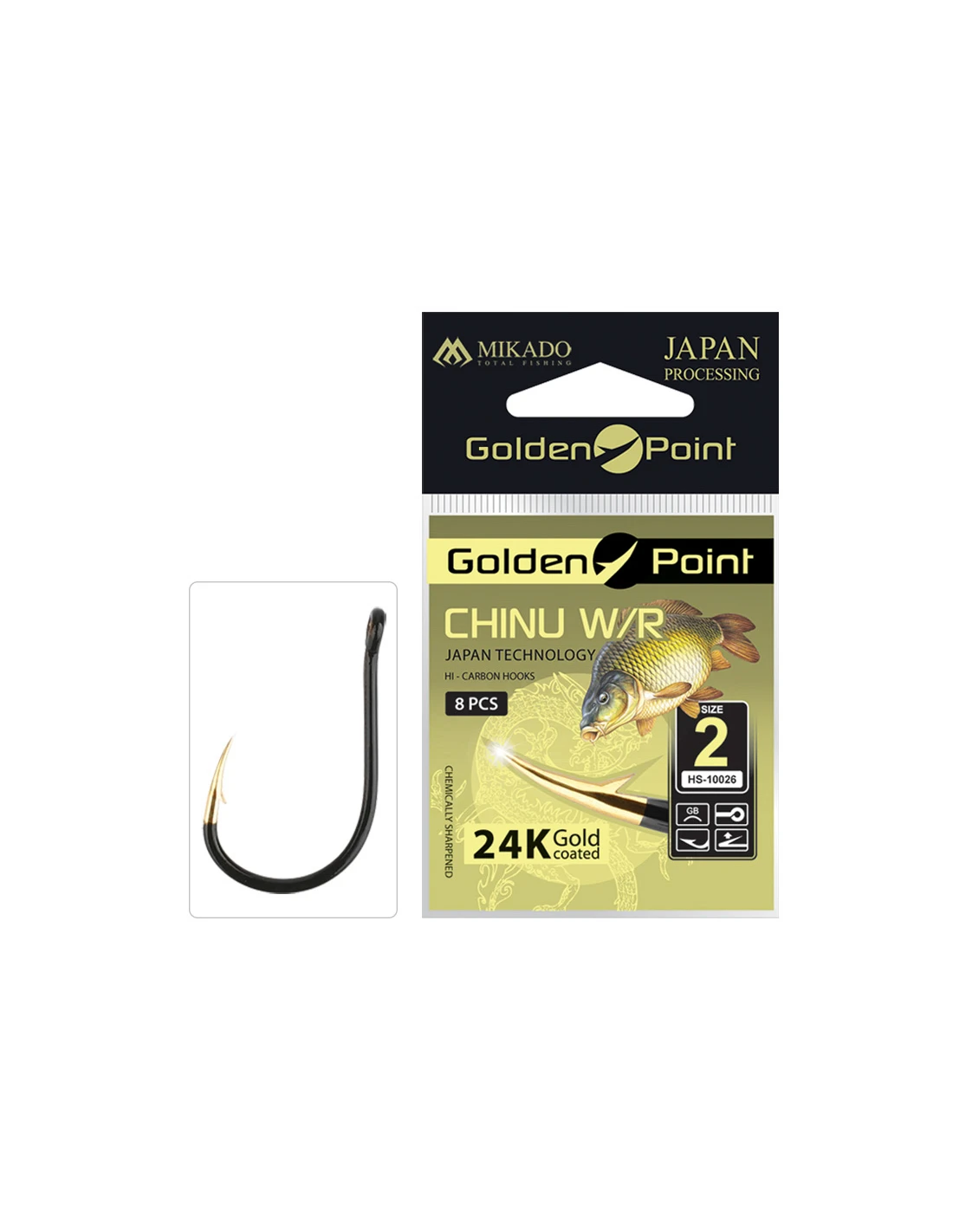 Haki Mikado Golden Point Chinu W/R to bardzo popularny haczyk z oczkiem, przeznaczony do połowu ryb karpiowatych. Jego grot został pokryty prawdziwym 24-karatowym złotem, co gwarantuje, że pozostaje wyjątkowo ostry nawet w trudnych warunkach, kolor złoto-czarny, a rodzaj grotu to haczyk z zadziorem.