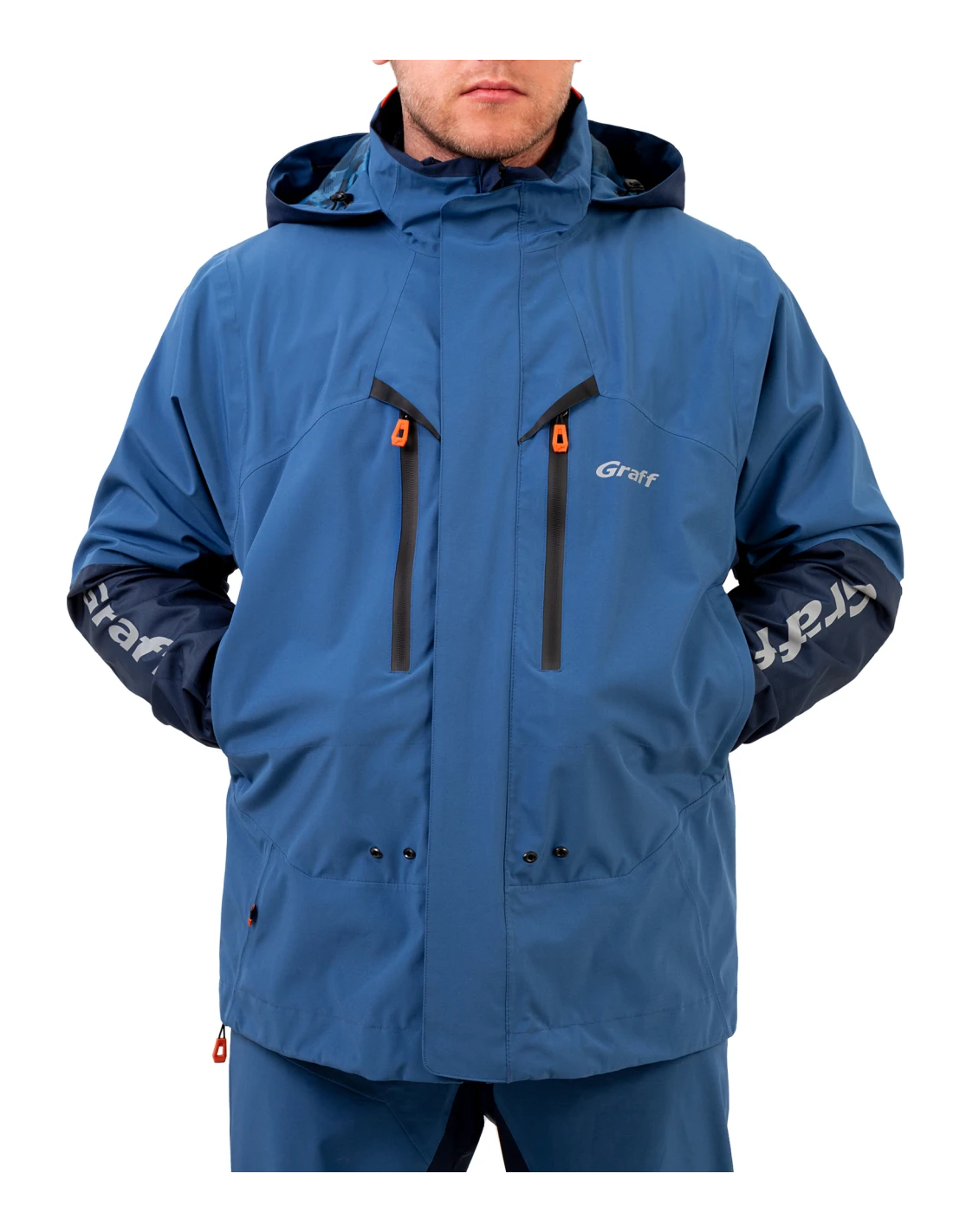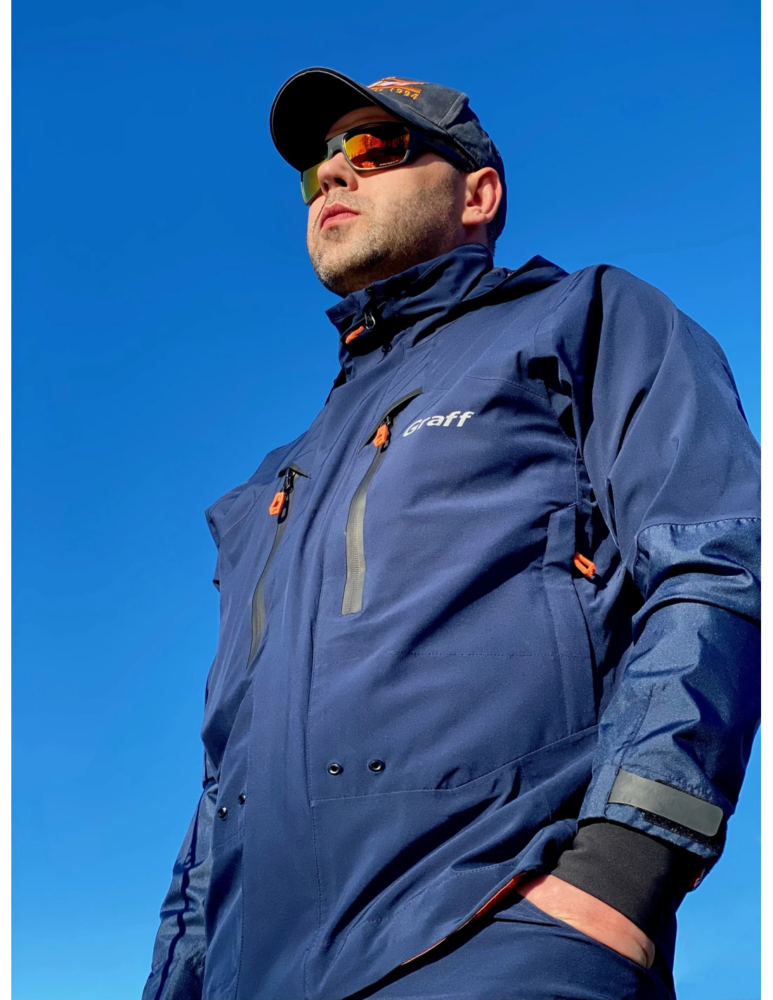 Wodoodporny komplet wędkarski Graff, w którego skład wchodzi kurtka wodoodporna 606-B-1 oraz spodnie wodoodporne 706-B-1.