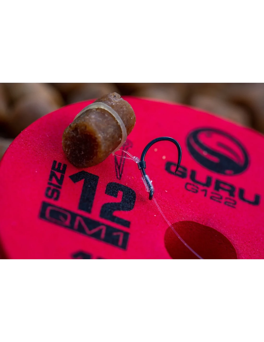 Gotowe przypony Guru zbudowane na hakach QM1, żyłce N-Gauge zakończone gumką. Idealne do łowienia na twarde pellety, waftersy, pop-upy, czy białe robaki.