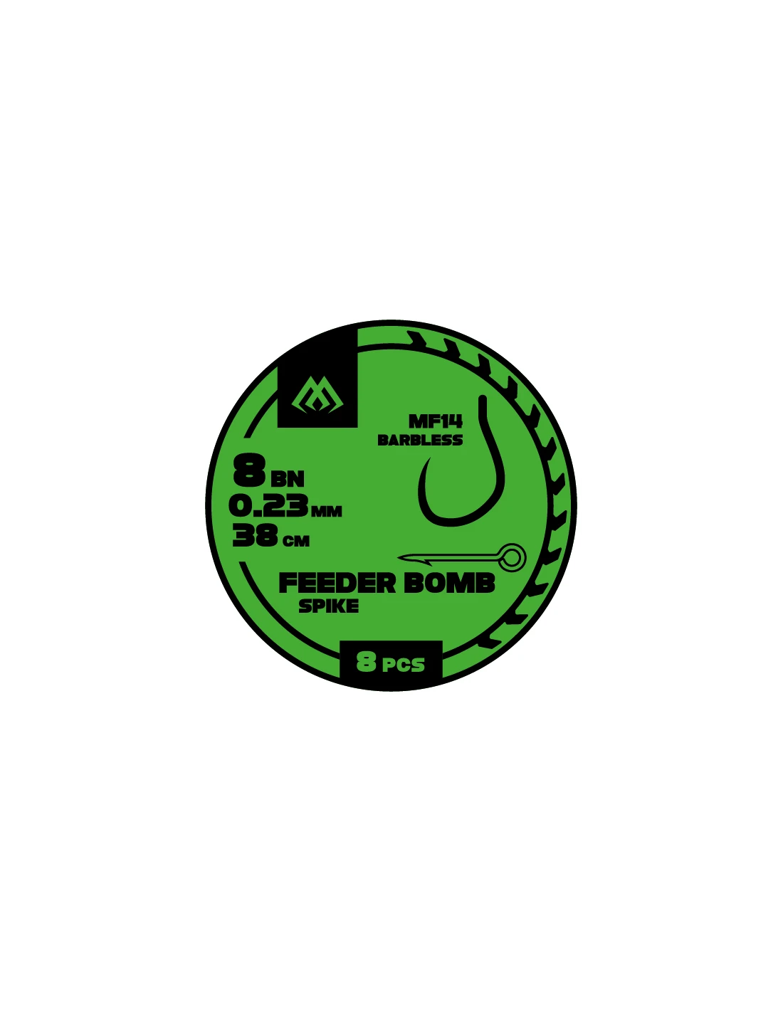 Gotowe przypony wędkarskie Mikado Feeder Bomb z Igłą MF14 o długości 38 cm i średnicy żyłki 0,18 mm. Są to przypony bezzadziorowe z hakiem MF14, zaprojektowane do łowienia dużych ryb. Idealnie sprawdzają się w technikach feeder bomb, wolno opadającej oraz pellet waggler, a stoper służy do prezentacji przynęty. W opakowaniu znajduje się 8 sztuk tych przyponów.