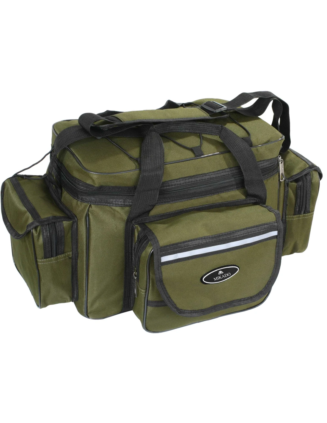 Torba wędkarska Mikado UWD-BLG-B to średniej wielkości, pojemna torba wykonana z wzmocnionego i impregnowanego materiału, łatwa do czyszczenia i wytrzymała. Jej podstawowa przestrzeń dzieli się dzięki wyjmowanym przegrodom na 4 części, co umożliwia wygodne przewożenie głębokich pudełek z przynętami, kołowrotków w opakowaniach i innych większych akcesoriów wędkarskich. Dodatkowo torba wyposażona jest w 3 boczne kieszenie oraz 3 zasuwane schowki na górnej klapie, idealne na drobniejsze przedmioty. Posiada wygodny, regulowany pasek na ramię oraz mocne, niezawodne zamki.