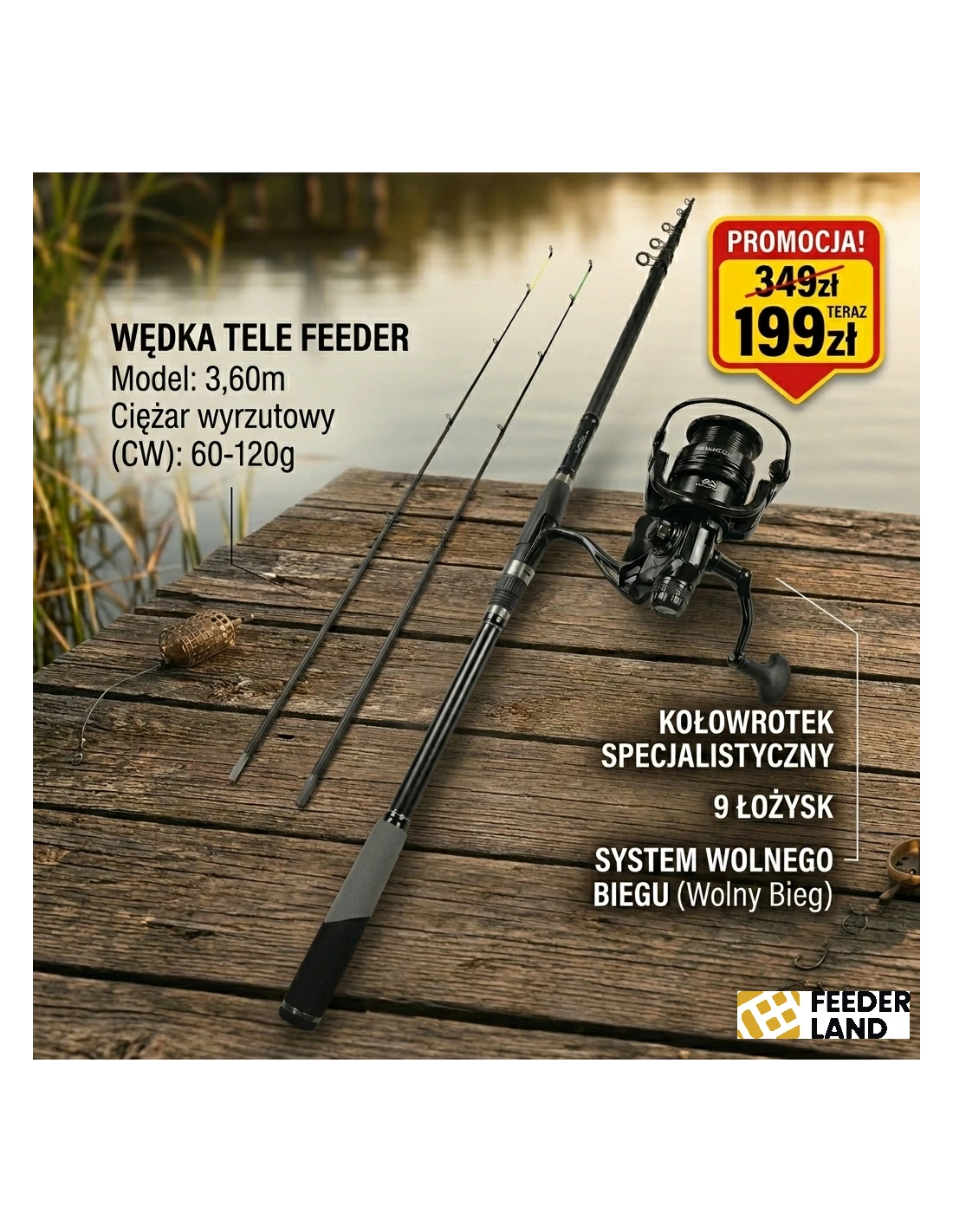 ZESTAW TELE FEEDER WĘDKA 3,60m 60-120G KOŁOWROTEK 9ŁOŻ WOLNY BIEG